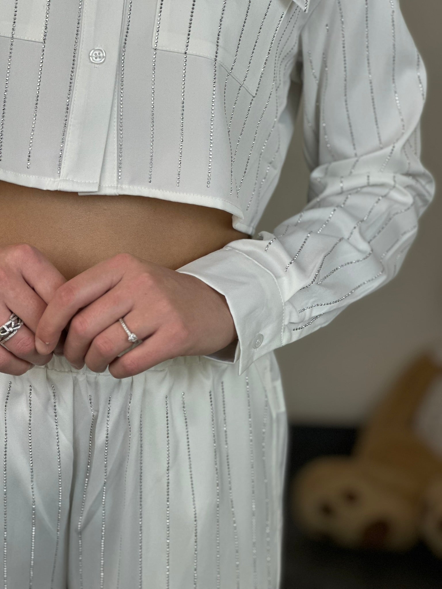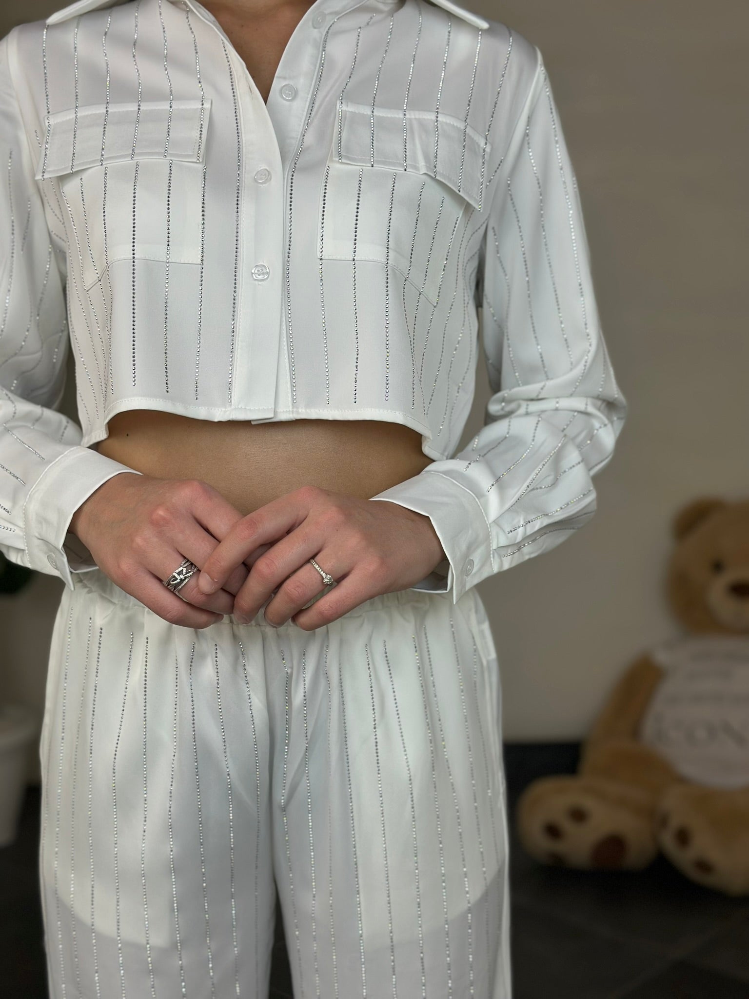 Camicia cropped a maniche lunghe con tasche frontali e chiusura con bottoni.