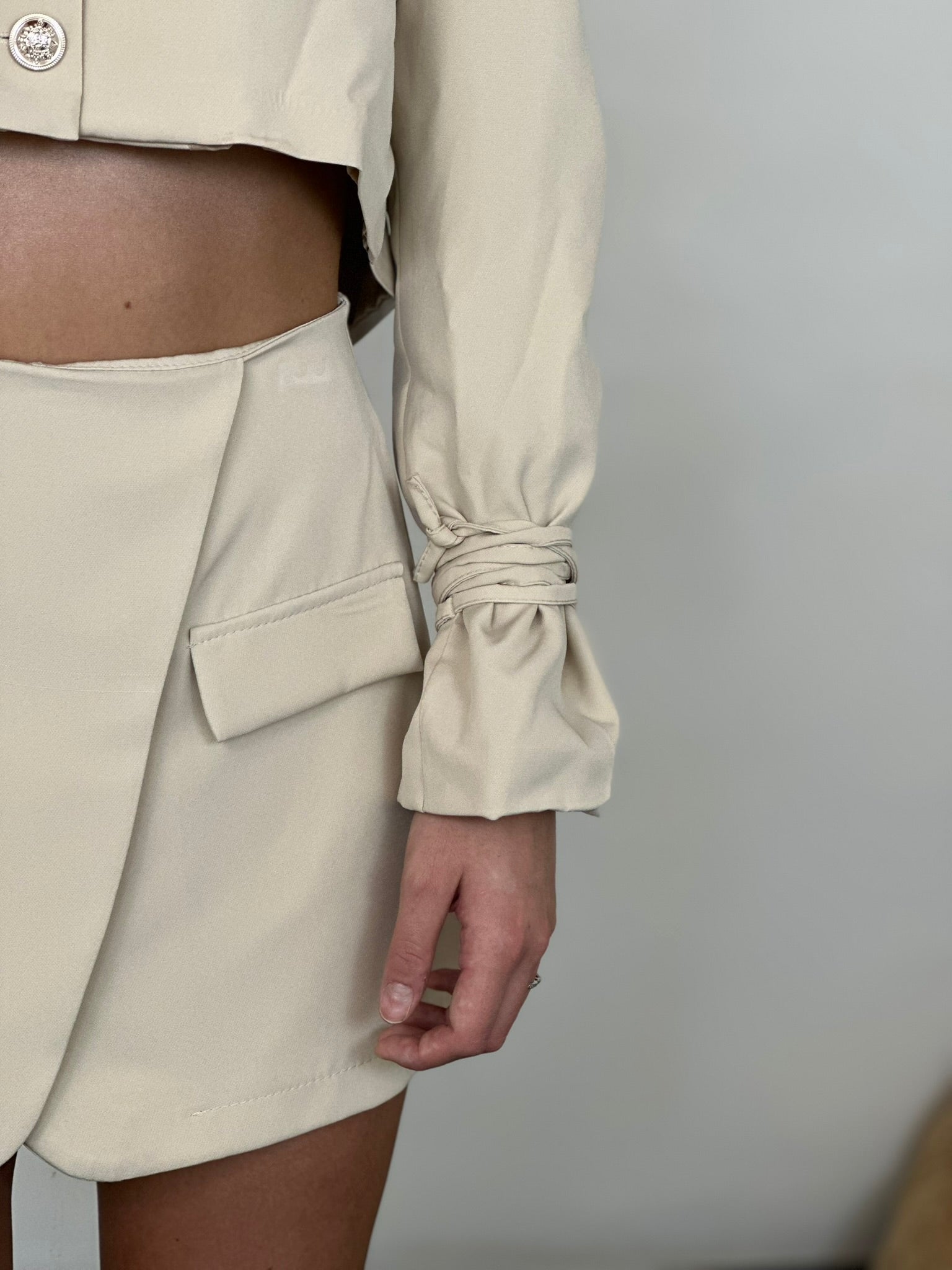 dettagli di lacci sulle maniche e bottoni dorati.